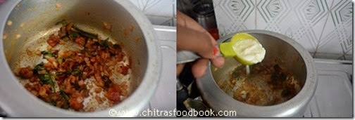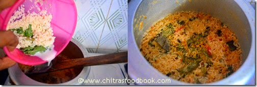 - Add the required salt. Check for taste and pressure cook in low flame for one whistle or 10 minutes. Open the lid after the steam is released. Mix with a fork once. Check whether rice is done else add 1/4 cup of water and allow it to cook for 1 whistle in high flame or keep it for 3-4 minutes in high flame.