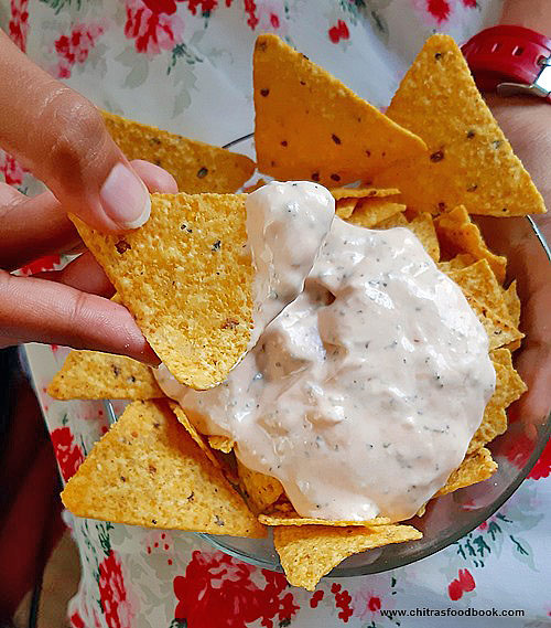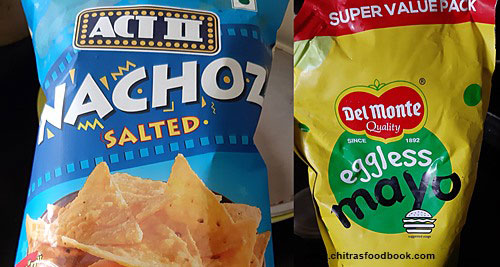 Usually Nachos is served with salsa, cheese sauce, bean dip, curd mayo dip etc. But I wanted to try some simple and instant dip recipe using store bought, eggless mayonnaise just like the ones served in restaurants like Mc Donald’s and Tacos. Finally I prepared this no cook, garlic flavored mayo dip without cheese and without fire when I was looking for some easy mayonnaise dips for chips and nachos. It can be served with potato wedges and French fries too. I won’t say this one tastes exactly like restaurants, but it tasted delicious. Kids would love it for sure. We relished it with salted nachos and potato chips for our weekend evening snacks. Raksha loved it very much. Basically we all love to eat chips with plain, store bought mayonnaise. When you pep it up with spices like garlic, oregano, basil, pepper powder, chilli flakes and Olive oil, it goes to the next level. So friends, do try this easy, instant, no cook, yummy mayonnaise dip for Nachos and chips. You will love it !