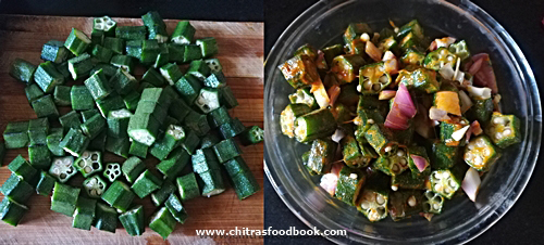 - Wash and pat dry lady’s finger with a towel. Chop into small roundels.