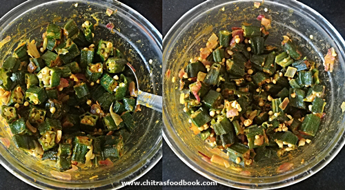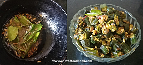 - Remove the lady’s finger after its cooked soft. In a small kadai, temper mustard, urad dal, cumin and curry leaves, add to the poriyal. You can add grated coconut if you like.