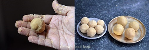 Diwali is fast approaching. To begin with celebration, I prepared besan ke ladoo/Gram flour ladoo( Kadalai maavu urundai in Tamil) using 2 methods. Besan ladoo is a very easy recipe but bit tricky.Generally North Indians prepare this laddu for Ganesh chaturthi but we south Indians make ladoo for Diwali and other special occasions. Roasting the gram flour properly gives you the best ,flavourful laddu.I referred tarla dalal,Sanjeev kapoor’s recipes and even vahchef’s video.The ingredients and the quantity mentioned everywhere was more or less similar. So I followed them and slightly adjusted the sugar & ghee as per my family’s liking.When I browsed for besan ladoo, I found shiny ladoos as well as the semi dry ones like we get in Haldirams and other sweet boxes.I tried both the versions using 1/2 cup of besan and shared the same here.There is no much difference in both the methods except the place of adding ghee.In first version, I used all the ghee for roasting the flour and it yielded shiny ladoos.For the second version,i followed my mom’s moong dal ladoo method and made it dry adding less ghee comparitively.I loved both but Sendhil’s vote is for the shiny ones