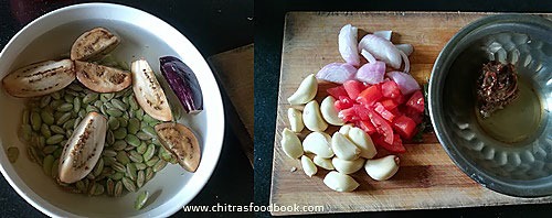 1. Wash and chop brinjal, tomato, onion. Peel garlic. Wash mocha kottai. Keep in water.