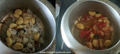 2. Heat oil in a pressure cooker & temper it. Saute onion, garlic, curry leaves. After it turns golden, add tomato and saute till mushy.