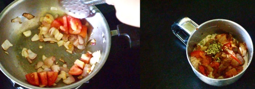 - Wash and peel onion, garlic. Heat oil in a kadai. Saute onion, tomato.