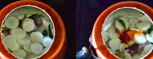 - Heat oil in a pressure cooker. Saute Cinnamon and bay leaf. Saute onion, garlic and radish slices.