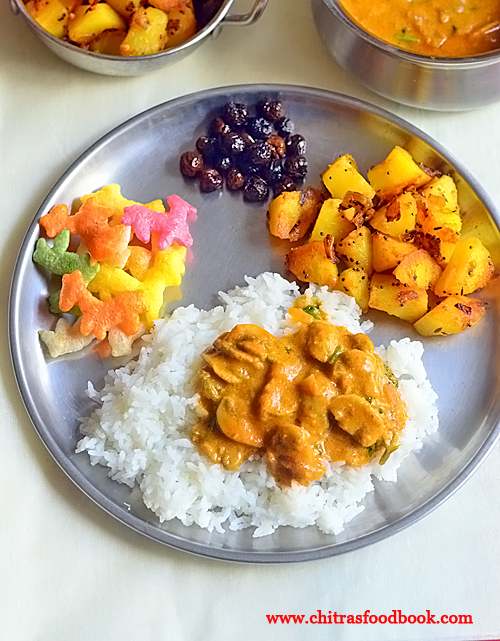- Mix with plain rice and enjoy with papad. I served with potato curry. To serve as a side dish for idli, dosa dilute the gravy like sambar by adding some water. Boil and serve. For chapathi, you can make it in kurma consistency.