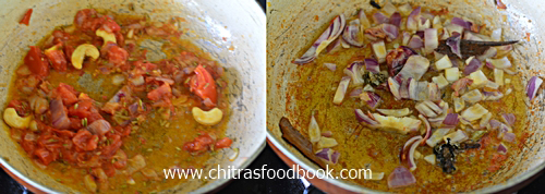 - In a kadai, heat oil. Saute fennel seeds, onion till transparent. Add tomato and saute till mushy. Lastly add cashews and mix well. Switch off the flame and cool down. Add coconut, coriander leaves. Grind to a smooth paste adding enough water.