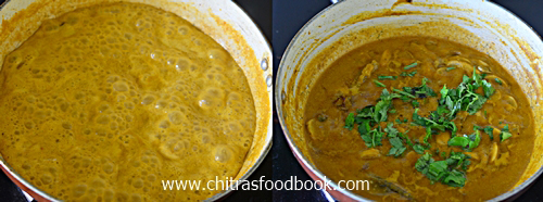 - Add the ground tomato paste and required water. Mix well and boil in low flame till oil floats on top. Gravy leaves a nice smell too. Switch off the flame. Garnish with coriander leaves. This kuzhambu thickens when it cools down. So add water to adjust the consistency. Check for salt too.