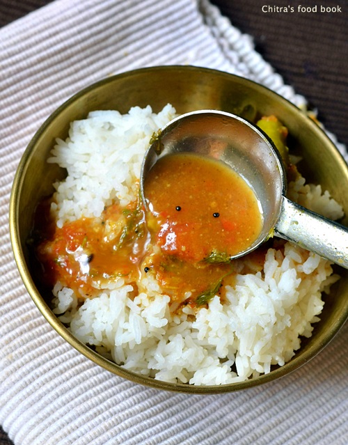 • Reserve 2 tbsp of cooked toor dal. Mash it well by adding 1/4 cup of water. Grind tomato to a smooth paste using little water & keep aside.