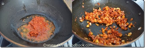 - In a kadai, heat gingely oil and saute the onions, garlic cloves and the ground paste. Saute till the raw smell leaves completely.