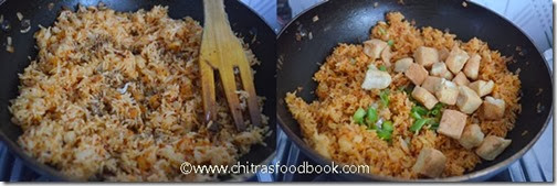 - Now add the cooked rice,soya sauce and mix well. Finally add the shallow fried tofu pieces and toss well. Garnish with spring onions and serve hot !