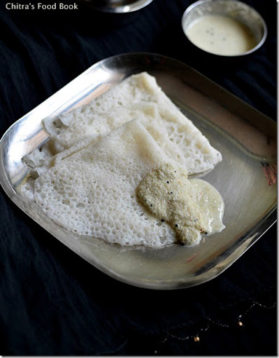 school moms) here, they told me an Instant neer dosa recipe which they mentioned as “thideer dosa” using rice flour and coconut. They also suggested coconut chutney and vegetable sagu as the best side dish for neer dosa. Neer dosa & chutney is the simple & best combination they added. So I prepared spicy, watery coconut chutney and it was tasting great. But one thing I have to admit is, this dosa won’t be filling even after having 5-6 nos if you are a good eater. So make sagu or any vegetable kurma if you want to have a tummy filling breakfast or dinner. Else make it as brunch or snacks;)
