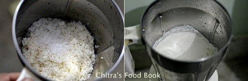 - Wash and soak the raw rice in enough water for 4-6 hours or over night. Drain all the water and grind it along with grated coconut and little salt.This dosa batter takes less salt so add it carefully. If you feel salt is less after grinding, you can add it later. But do not add more salt while grinding. First grind the rice & coconut to a coarse paste without adding water and then add 1 cup of water to make a smooth paste.Wipe the sides & the jar while grinding. I used my bigger sized mixie jar to grind the batter.