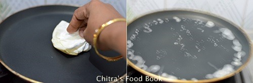 - To make dosas, a good conditioned non-stick dosa pan or frying pan with handle is needed. Heat the dosa pan well. Sprinkle few drops of water and if water droplets go off within few seconds, heat is just right. Then dip a cloth or tissue paper in oil and grease the pan well. Proper heating of pan and good greasing is very important. Keep the flame high.