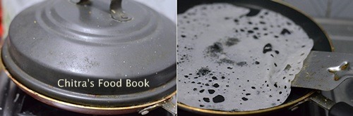 - Cook the dosa in low flame with a lid for 30 seconds and without lid for 30 seconds. Do not brown the dosa. It should be white. No need to flip the dosa.