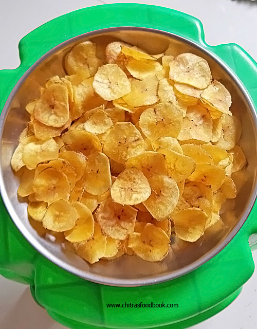 It stays good for a week if properly fried. Addition of turmeric powder gives a nice color to the chips. So do not skip it. Make sure you toss the chips every now and then for uniform cooking. Also make sure the bubbles stop before you remove from oil. This helps you to make a perfect Nendran banana chips at home. Ok, lets see how to make Kerala special Nendran banana chips at home with step by step pictures.