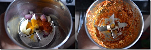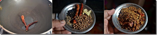 - Fry the dry red chilli for a minute. Grind together fried red chilli, pepper corns, garlic, jeera and coriander seeds slightly coarse in texture OR U can make it to a coarse paste as per the original recipe.