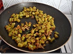 - Heat a tsp of oil in a kadai and fry the beans till it starts to crackle.( This step is not in the original recipe. But I did it for additional flavor)