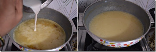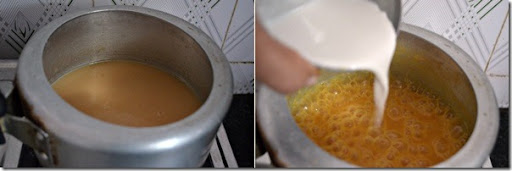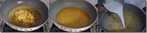 - In a pan , melt jaggery , make syrup and strain the impurities.Add the mashed dal to the syrup . Add the second coconut milk and ghee & boil till it reduces to half..