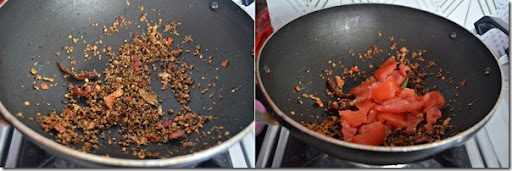 - Heat oil , fry ground masala for 2-3 mins. Add chopped tomatoes and mix well. Cook till tomatoes become soft.