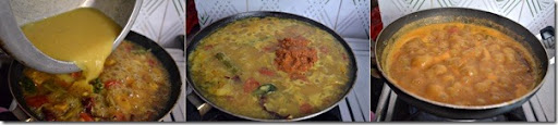 - In a kadai , heat oil, temper mustard seeds, red chilli , curry leaves and saute the onions , tomatoes & curry leaves. Saute till tomato turns mushy. Add tamarind extract ,salt and curry leave. Allow it to boil well, add all the vegetable and boil the tamarind extract till the veggies cook well.