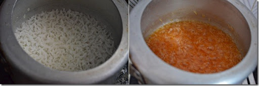 - Wash n soak raw rice for 20 minutes. Pressure cook it adding 1/2 – 3/4 cup of water. Rice should be cooked but it should not be mushy.