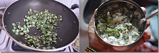 - In a kadai , add oil , temper mustard seeds and curry leaves.Then add the finely chopped lady’s finger & green chillies and saute in high flame continuously .Add salt , sugar and saute till it is cooked well.