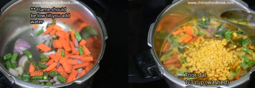 - Add chopped onion, chopped carrot, beans and mix quickly. Add washed toor dal. Add required water, jaggery and salt. Lastly add one whole tomato.