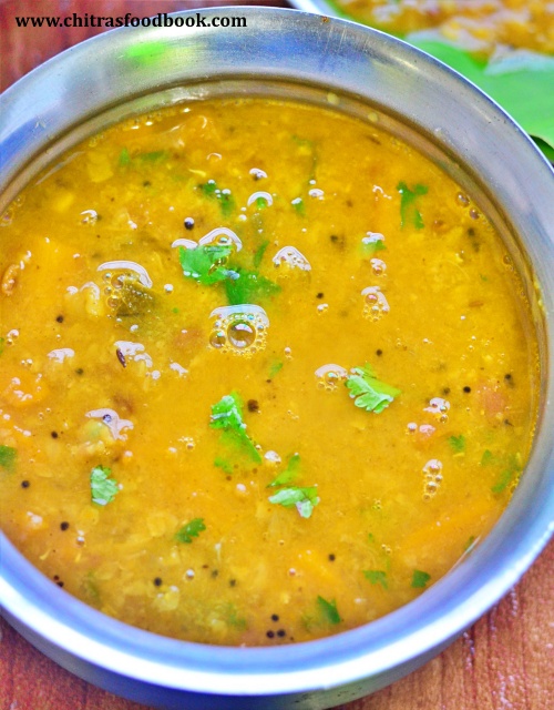- Mash the dal well. Boil for a minute if sambar is watery. Garnish with coriander leaves and add a tsp of ghee.