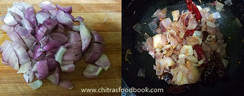 - Heat oil in a kadai. Saute red chilli and onion adding salt and tamarind.