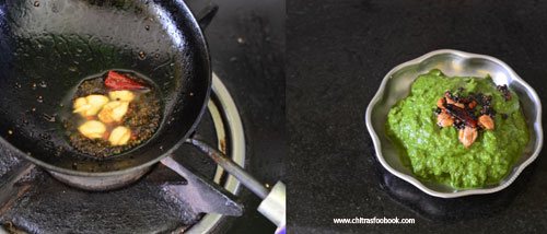 - Heat oil in a kadai. Temper mustard seeds, urad dal, crushed garlic and red chilli.