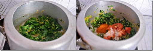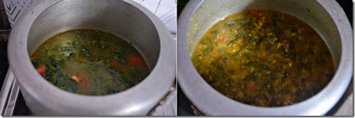 • Wash and chop the palak leaves.In a pressure cooker base , heat a tsp of oil.Saute the leaves for a minute till it shrinks. Add moong dal , sambar powder , turmeric powder , tomato ,salt and water. Mix well and pressure cook in low flame for one whistle.