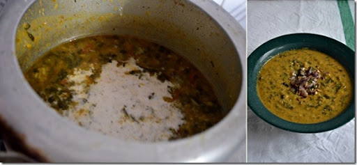 • Pressure cook it in low flame for one whistle. After the steam is released, add the ground coconut paste.Mix well and boil the mixture.