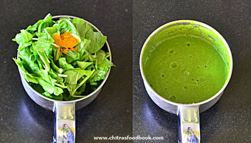 - In a mixie jar, grind palak and other ingredients given under “To Grind” to a smooth paste.