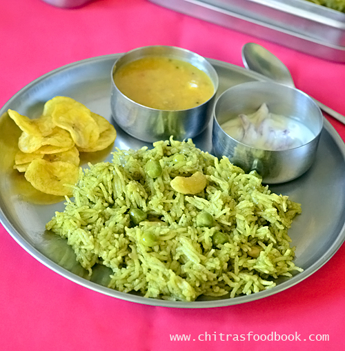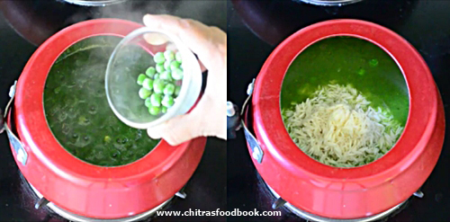 This recipe is very similar to my Karnataka style veg palav recipe. To make this palak rice bright green in color, add some turmeric powder and sugar. I have added frozen green peas. You can also add mixed vegetables like carrot, beans, potato, paneer pieces to make this rice more healthy and filling.