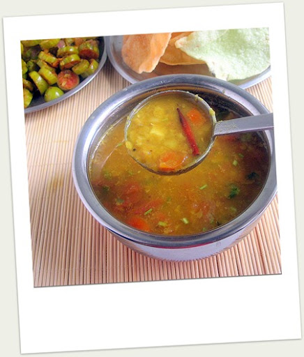 I make this Tamilnadu style paruppu rasam when I feel lazy to cook. It is different from the usual rasam in taste as well as texture. We add sambar powder instead of rasam powder and it would be thick in consistency. I add more crushed garlic which gives an excellent flavour. .I learnt this from my MIL. I make this in weekends along with a poriyal and thogayal. It makes a complete meal with a stir fry (poriyal) and appalam /papad as accompaniments..