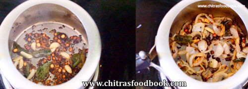 - Heat oil in a cooker. Splutter mustard seeds, urad dal, chana dal and hing.