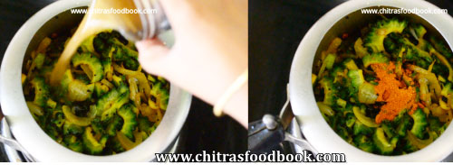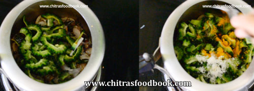 - Add chopped bitter gourd and saute for few minutes till it shrinks in size.