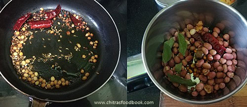 - In a kadai, heat oil and roast urad dal, chana dal, red chilli, curry leaves, cumin seeds.