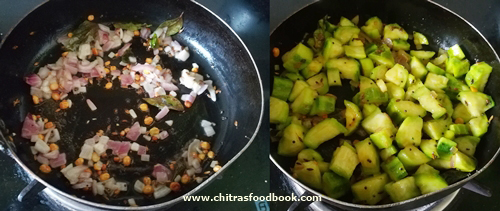 - Saute onion, curry leaves. Add ridge gourd pieces, salt, turmeric powder, sambar powder and sugar.