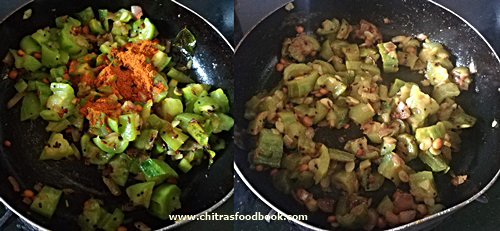 - Mix well and saute in low flame. Cover and cook till ridge gourd becomes soft.