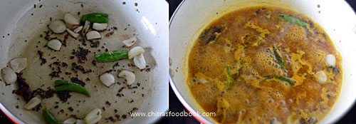 - Heat oil in a kadai and splutter mustard seeds, methi , cumin seeds, red chillies. Saute big onion or small onion till transparent.