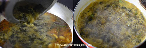 - Now add the cooked dal + keerai and boil for few minutes. Remove and transfer to a bowl.
