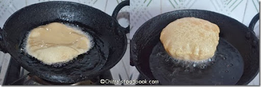 • Heat oil to deep fry. To check the right temperature of oil,put a small piece of dough. It will rise immediately at the same time it should not be browned. This is the perfect heating of oil. Immediately slide the poori and after a second, press it with a slotted ladle. It will puff up well. Flip it carefully and allow it to cook for few seconds till  the bubbles cease. Remove and lower the flame till you drop the next poori .Drain in a tissue paper. Keep the flame high and repeat the same for remaining pooris.