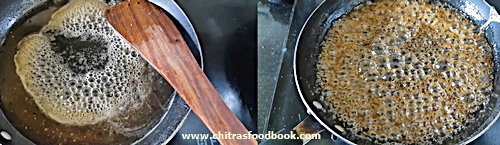 - Boil the jaggery syrup till frothy. Pour few drops of syrup and gather with fingers.