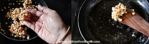 - Add the fried gram dal and mix quickly. Grease hands with ghee and make balls.