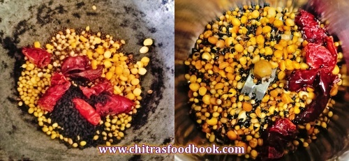 - Heat 1 tsp oil in a kadai and roast all the ingredients given under “to roast and grind” to a coarse rava like powder. Set aside.