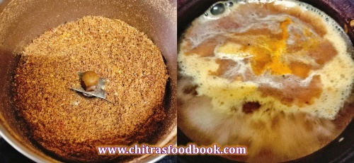 - Add the tamarind extract in a vessel adding salt, turmeric powder. Boil till thick.