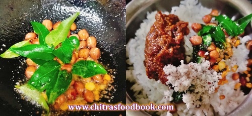 - Heat cooking oil in a kadai and temper mustard, urad dal, chana dal, roasted peanuts, curry leaves and hing.