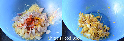 • Slice the onions thinly.Mix all the ingredients in a bowl for making pakora.Do not add water.Mix all the ingredients well and leave it aside for 10 minutes.After 10 minutes,onions leave water.So mix it well and if required sprinkle 1 tbsp of water.Lastly add the cooking soda and mix well.Heat oil in a kadai and sprinkle the pakora in oil.